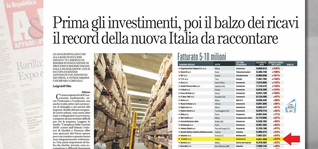 Con l’incremento del fatturato di +54% nell’anno 2017, Treadim ha raggiunto il prestigioso traguardo di CAMPIONE DELLA CRESCITA categoria DIAMANTE (il riconoscimento più prestigioso) nella classifica annuale stilata da AFFARI & FINANZA, l’inserto del quotidiano nazionale LA REPUBBLICA specializzato in ECONOMIA e QUALITÀ degli INVESTIMENTI. Le indagini di mercato, finalizzate ad analizzare l’aspetto economico e qualitativo delle aziende attive in diversi settori, sono state svolte da LA REPUBBLICA in collaborazione con l’Istituto Tedesco Qualità e Finanza del gruppo editoriale Burda, leader europeo delle indagini di qualità. Le indagini sono obiettive ed imparziali e non possono essere sponsorizzate in alcun modo dalle aziende coinvolte negli studi. I test si sono basati sulle valutazioni di rinomati esperti di finanza ed economia e su metodi scientifici. Prima gli investimenti, poi i ricavi: l’impiego di risorse in innovazione e di risorse umane ha permesso a Treadim di conquistare il riconoscimento Diamante, assegnato alle realtà capaci di mettere a segno un progresso nel giro d’affari superiori al 50%. Quindi, nonostante la doppia recessione che ha colpito l’Italia nel corso dell’ultimo decennio, Treadim ha gettato basi solide nel futuro investendo nel presente, nelle idee e nelle persone.